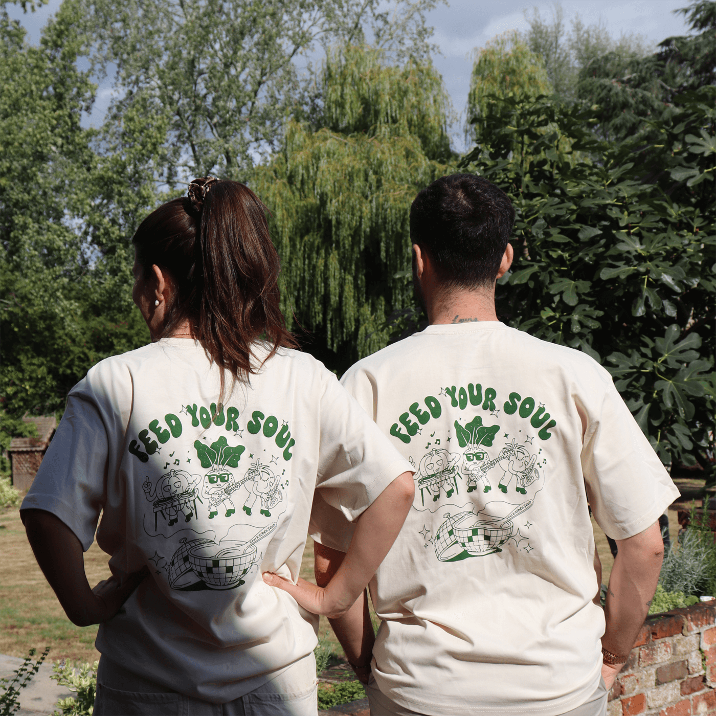 Wear your veg with pride 🌿👕. Our limited-edition “Feed Your Soul” T-shirt features playful cartoon vegetables and a positive reminder to keep your soul nourished.