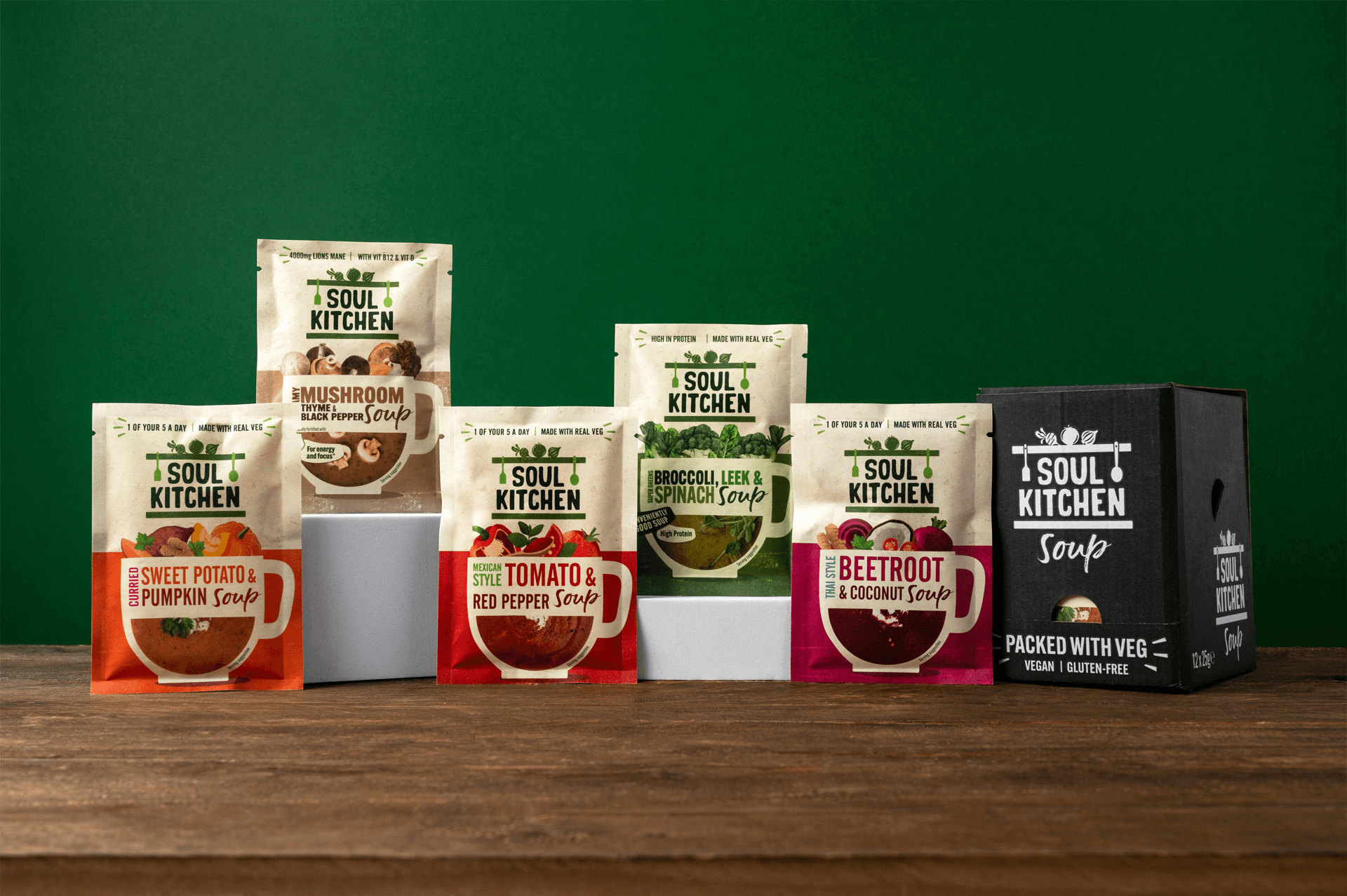 Experience the full Soul Kitchen collection with our 15-Serving Variety Pack. You’ll get 3 of each of our 5 flavours — Mexican Style Tomato & Red Pepper, Curried Sweet Potato & Pumpkin, Thai Style Beetroot & Coconut, Mushroom, Thyme & Black Pepper, and Super Greens: Broccoli, Leek & Spinach.